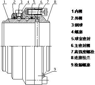 鋼制旋轉接頭主要由內圈、外圈、法蘭、主密封件、滾道密封、鋼球和聯接螺栓等零件組成(見下圖)